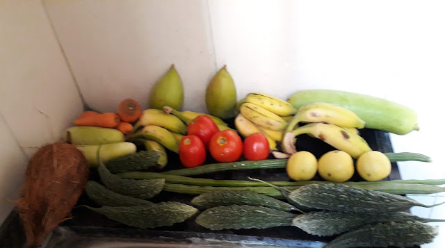 Carrots, tomatoes took the place of snake gourd and ash gourd. Adjustment - that's the key word. So I grabbed whatever I could from my vendor and laid out a colorful spread. I was happy with what I managed - at least there seemed to be enough. There were exchanges on social media - of pictures of 'vishukkani' of friends / relatives. Looking at the near-perfect 'kani'of a friend, I suspected her of posting a photo of last year .... and I was right! Poor thing, she was so disheartened by this year's 'apology of vishukkani' that she didn't click the customary photo for sharing.